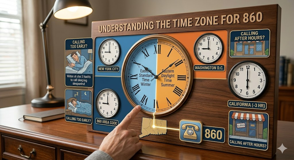 If you are planning to call someone in the 860 area code, you need to check your watch first. This region follows Eastern Standard Time (EST) during the winter months. In the summer, it switches to Eastern Daylight Time (EDT). This is the same time zone used by New York City and Washington, D.C. If you are calling from California, remember that Connecticut is three hours ahead of you. Knowing the time zone helps you avoid waking someone up too early or calling a business after they have already closed for the night.